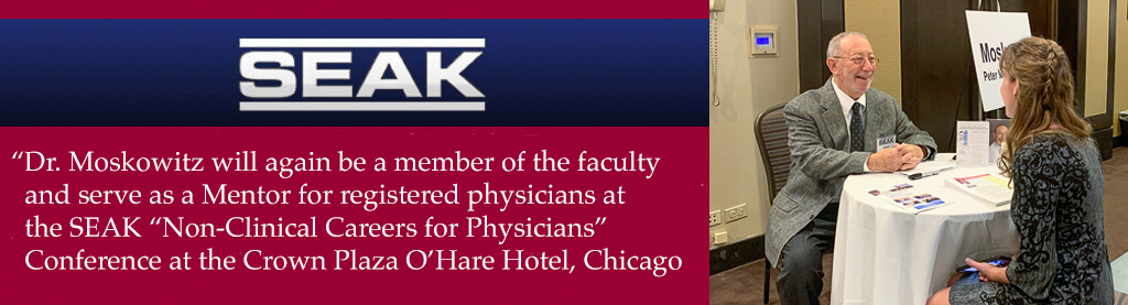 Founder, Peter Moskowitz, M.D., a certified career transition and life coach, has spent nearly two decades helping hundreds of doctors manage change, transition to new non-clinical careers, revise existing clinical careers, manage the stresses and challenges of clinical practice, avoid or manage professional burnout, improve their work-life balance, their leadership effectiveness, plan for “protirement,” and regain satisfaction and meaning in the practice of medicine.