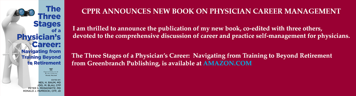 Dr. Moskowitz is co-author of the new book, “The Three Stages of a Physician’s Career: Navigating from Training to Beyond Retirement,” published in 2017 by Greenbranch Publishing. This valuable career management resource targeted to students, trainees, and practicing physicians, discusses specialty selection, career and transition planning, practice management, asset growth and protection, and staying healthy from medical school through retirement.